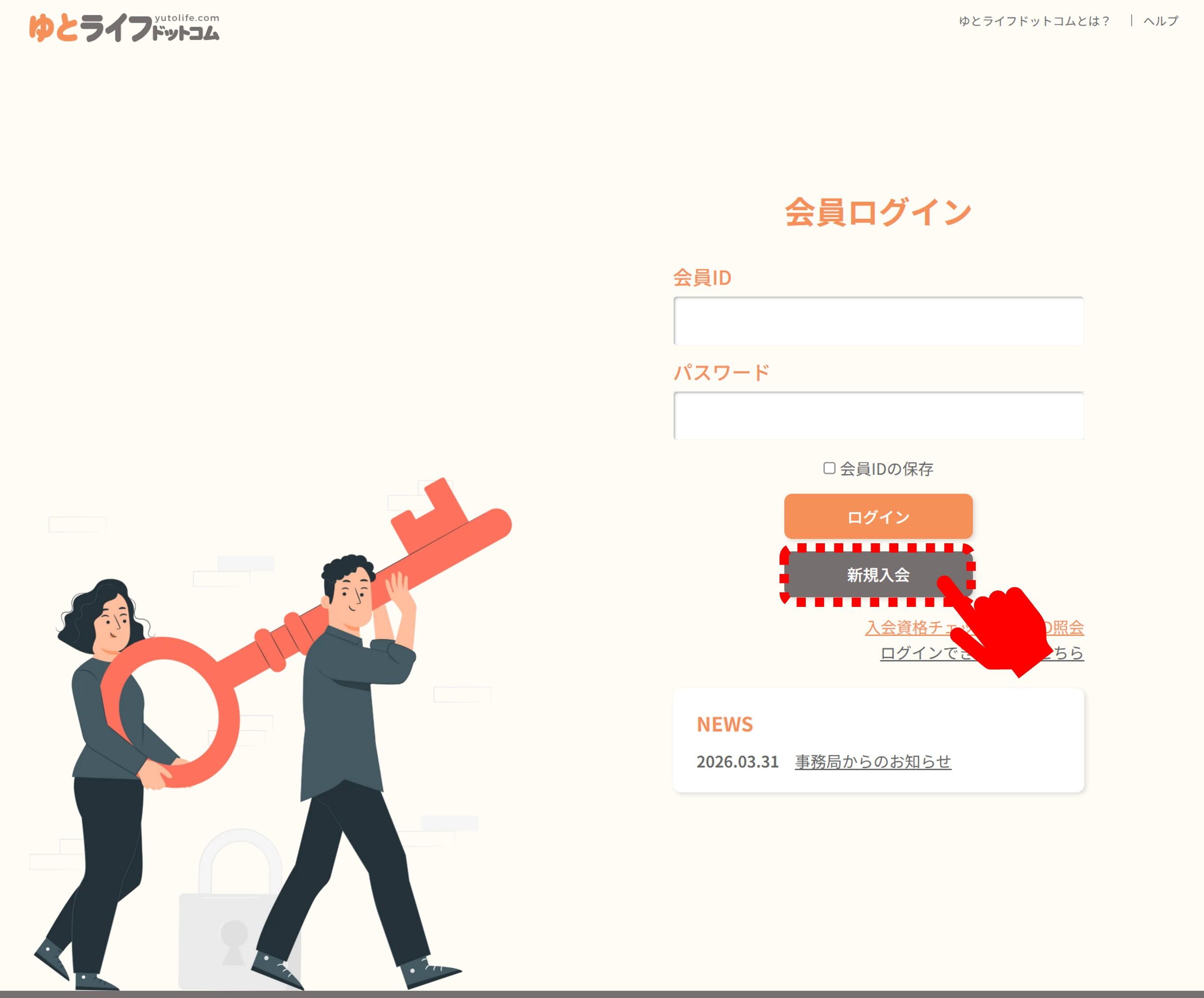 - https://www.yutolife.com/にアクセスし、「新規入会」をクリック